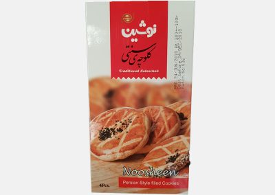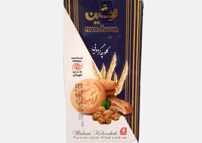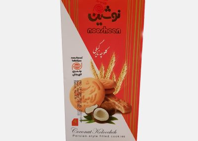 Coconut & Walnut Cookies “KOLOOCHEH”, a kind of cookie also known as Persian-style filled cookie, filled with coconut, walnut, chocolate, and traditional style. Net weight: 50 g Unit per pack: 4 cookies Unit per box: 50 packs Shelf life : 6 months Back